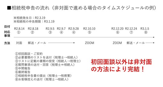 そこで今回は、お客様からご依頼いただいた相続税申告で、できる限り非対面の報告方法で進めた事例を実際のタイムスケジュールをお示ししながらお伝えしたいと思います。