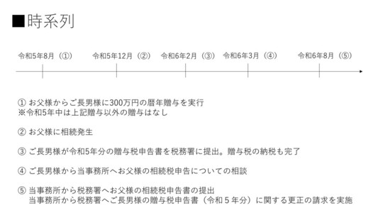 そこで、当事務所は令和6年8月に被相続人の相続税申告書を提出するとともに、ご長男様が支払った令和5年中の生前贈与に係る贈与税を取り戻す更正の請求の手続きを同時に行い、贈与税の還付を受けました。