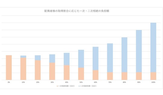 一次相続で奥様が取得する遺産の割合を11パターン作成し、それぞれに応じた相続税額と二次相続の見込み相続税額をシミュレーションしました(下のイメージ図をご参照ください)