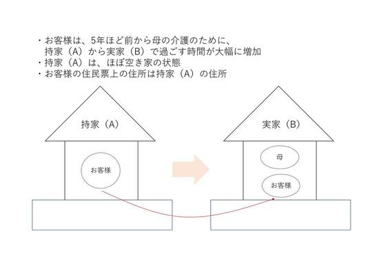 1人暮らしの家(A)には、たまに帰る程度でほぼ空き家の状態であり、実家(B)で過ごす時間と1人暮らしの家(A)で過ごす時間は、概ね9対1くらいの割合で、圧倒的に実家(B)で過ごす時間の方が長かった。ただ、お客様の住民票上の住所は1人暮らしの家(A)の住所であった。