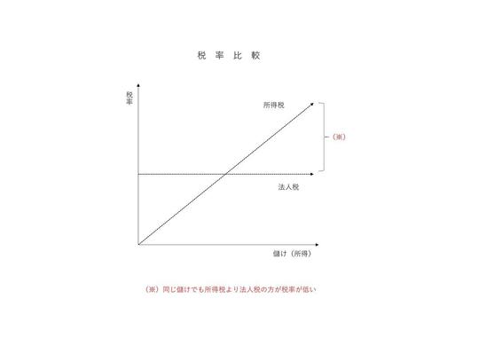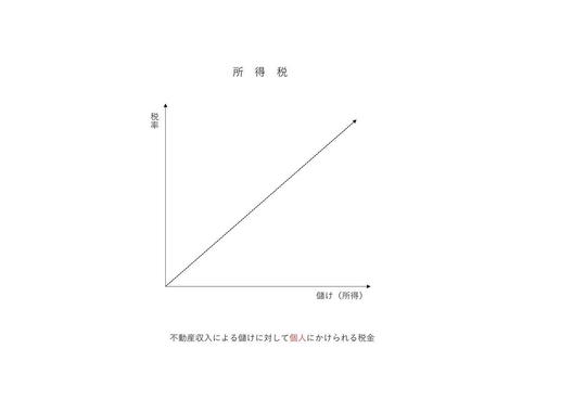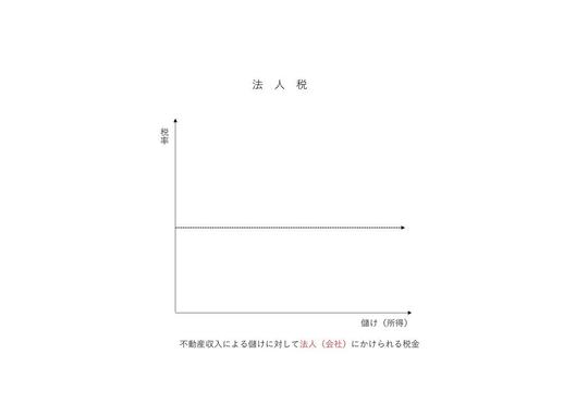 イメージとして所得税の税率は右肩上がり、法人税の税率は並行となりますので、儲け(所得)がある水準を超えると、賃貸不動産からの賃料収入という同じ内容の儲け(所得)でありながら個人に対して課せられる税金(所得税)の方が、会社に対して課せられる税金(法人税)よりも大きくなることがわかります。