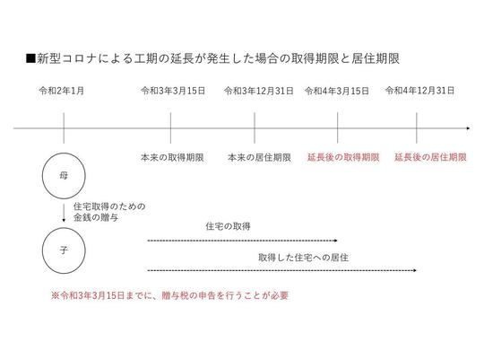 ただ、新型コロナの影響で工期が延長され、期限内の取得・居住が難しくなった場合は、取得期限が令和4年3月15日、居住期限が令和4年12月31日となります。
