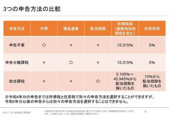 申告分離課税と総合課税では所得税や住民税の税率が異なりますので、どのような申告方法が有利か事前にしっかりと検討した方がよいでしょう。