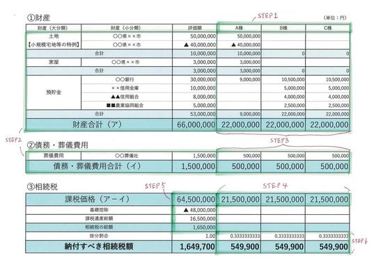 STEP6では、相続税の総額に各相続人が財産を取得した割合を乗じて、各相続人の相続税額を計算します。