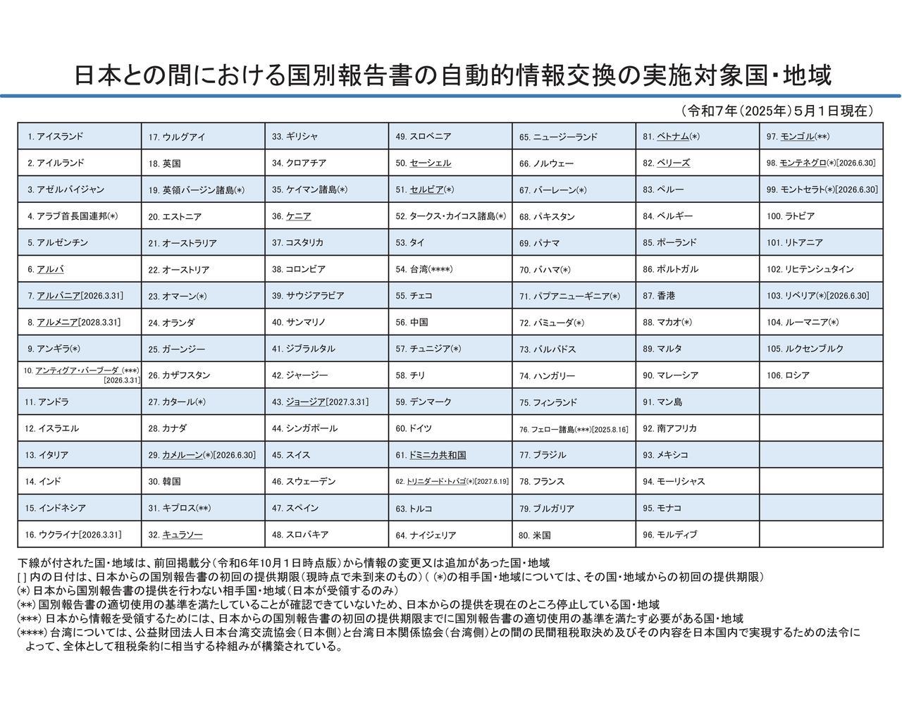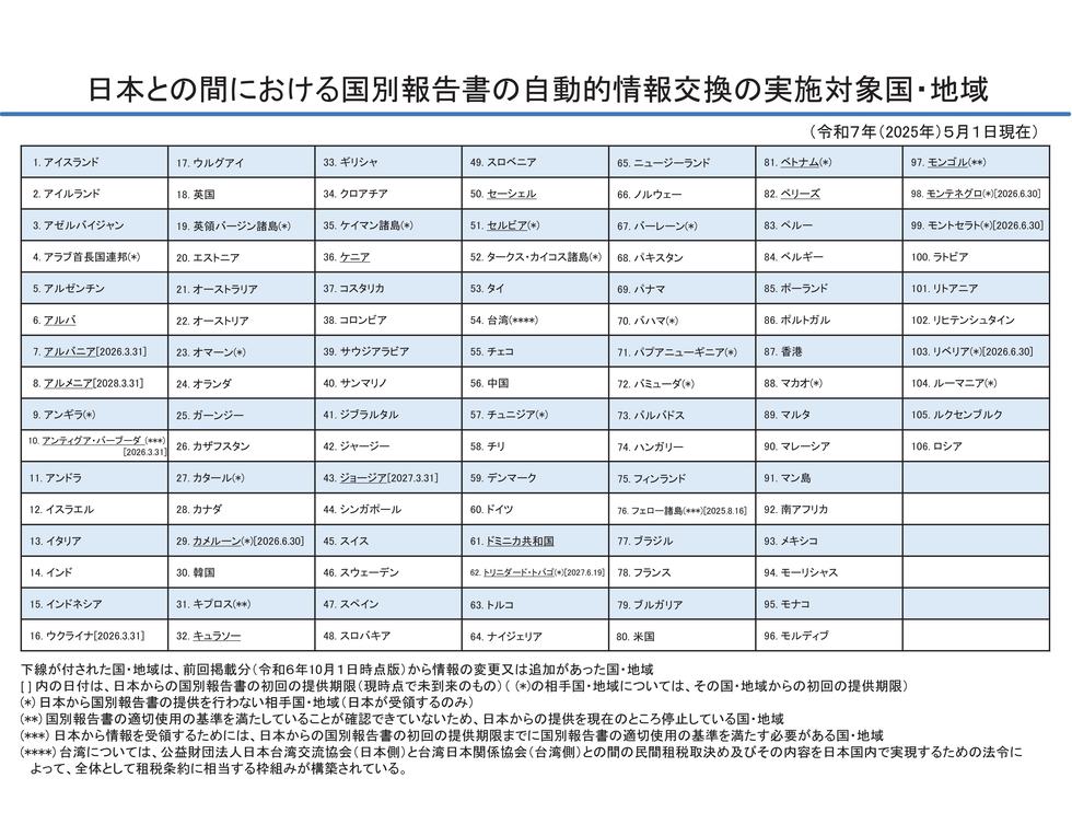 (※)日本との間で、この情報交換制度を行っている国は以下のとおりです(本記事執筆時点)。なお、アメリカは別の制度(FATCA)で対応しているため下の図には登場しません。