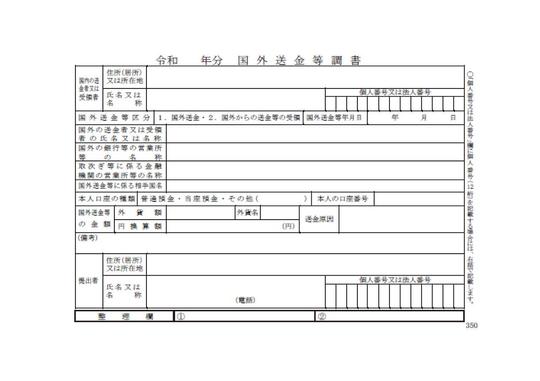 国外送金等調書と異なり100万円といった金額の制限はなく、該当する移管または受け入れがあった場合は、すべて調書として税務署に提出されます。