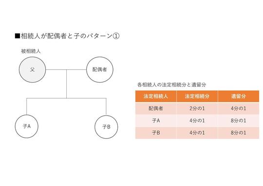 配偶者と子供が法定相続人となり、配偶者の法定相続分は2分の1、子供全体の法定相続分は2分の1で子供の人数で割った数字が、それぞれの子供の法定相続分となります。