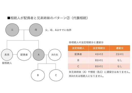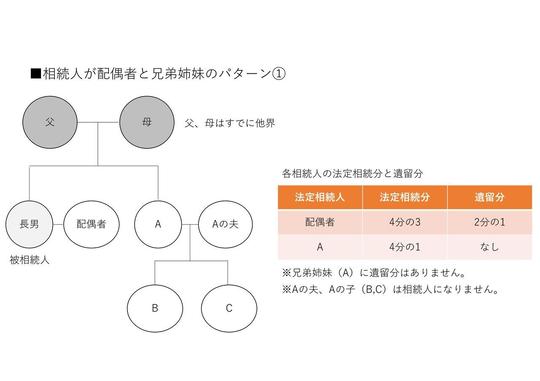 相続人が配偶者と兄弟姉妹となるパターンは次の図のような場合です。子供のいない夫婦はこのパターンに当てはまることが多いと思います。