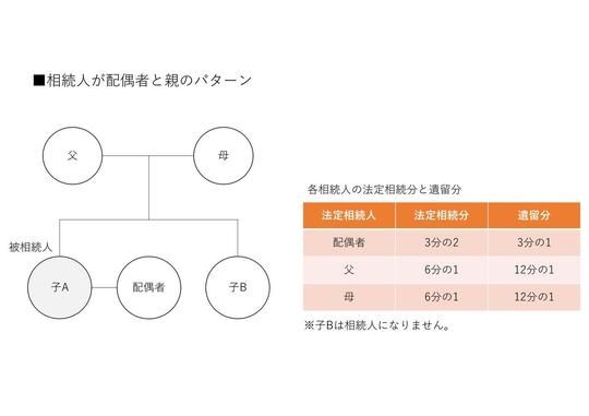 相続人が配偶者と親となるパターンは次の図のような場合です。子供のいない夫婦で若くして相続が発生したような場合が該当します。