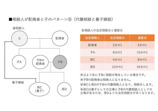 孫Cは被相続人と養子縁組をしていますので、被相続人の子としての立場を有します。一方で、本来の相続人である子Bが被相続人より先に亡くなっているので、子Bの代襲相続人としての立場も有します。