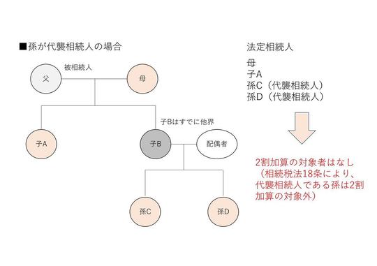 この場合は、孫C、孫Dは子B(1親等の血族)の立場を引き継いでいるので、2割加算の対象外と考えるのがわかりやすいかと思います。