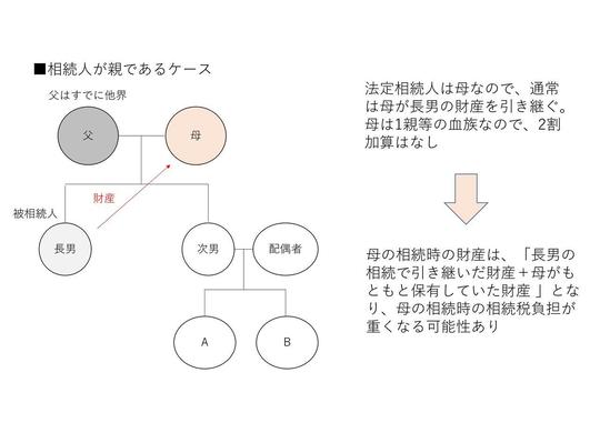 例えば、上のような家系図で長男に相続が発生した場合は、法定相続人は母になります。母が長男の財産を相続した場合は、母は長男の1親等の血族ですから2割加算の対象にはなりません。