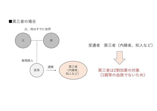 特定の方とは、配偶者と1親等の血族以外の方になりますので、大まかには配偶者・子・親以外の方が相続で財産を受け取った場合は、相続税が2割加算されることになります。