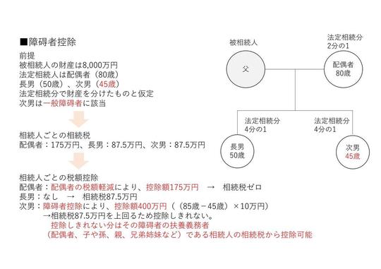 障碍者控除の箇所で少し触れましたが、例えば相続人である配偶者が障碍者である場合は、配偶者の税額軽減と障碍者控除の適用が考えられます。