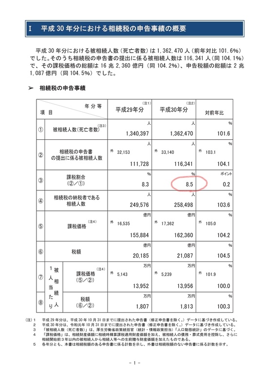 画像を2つご用意しました(クリックすると拡大されます)。財務省のものは、2つある折れ線グラフのうち下の課税件数割合とあるグラフが2017年までの課税割合の推移を示しており、国税庁のものは赤丸をつけたところが最新の2018年の課税割合を示しています。