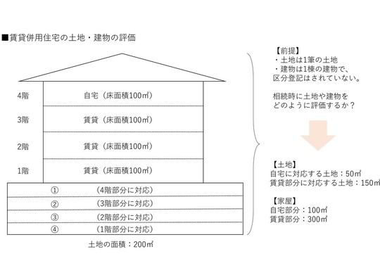 200㎡の土地の上に4階建ての建物があり、1階から3階は賃貸、4階を自宅として利用しているものと仮定します。
