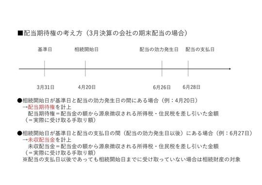 基準日は3月31日となりますので、この時点で配当を受領する権利を持っていることになります。ただ、実際に配当金の効力が発生する日(図では6月26日)は相続発生後であるため、配当を受け取る前にお亡くなりになったことになります。