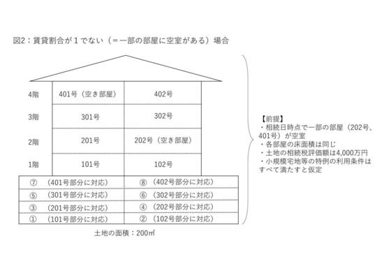 今回は、賃貸割合が1でない場合(相続日時点で賃貸していない部屋がある場合など)の小規模宅地等の特例の効果を確認しました。