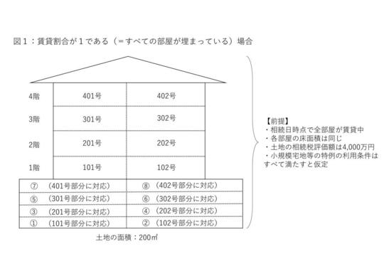 例1は図1のとおり、賃貸物件の部屋がすべて埋まっている状況を想定しており、この場合は賃貸割合を1と考えます。
