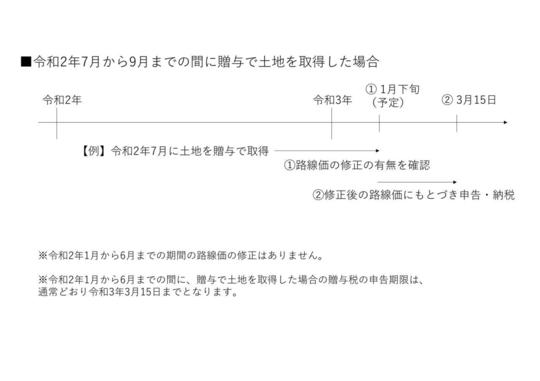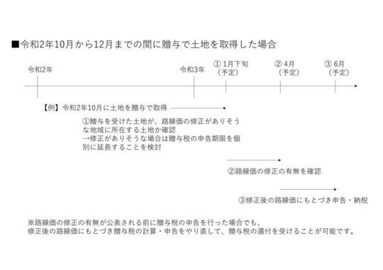 なお、令和2年10月から12月までに贈与で土地を取得した場合、路線価の修正の有無は令和3年4月まで正確にはわからないことになります。