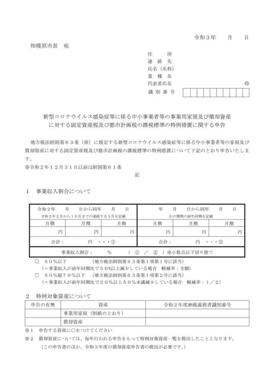 なお、中小企業庁から申告書の参考様式が公開されており、それを参考に市区町村ごとに申告書の様式を定めています。ちなみに、相模原市では以下の様式(一部抜粋)となっており、中小企業庁の参考様式とおおむね同様のものになっています。