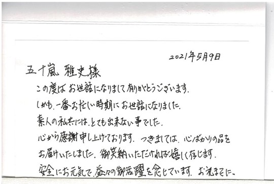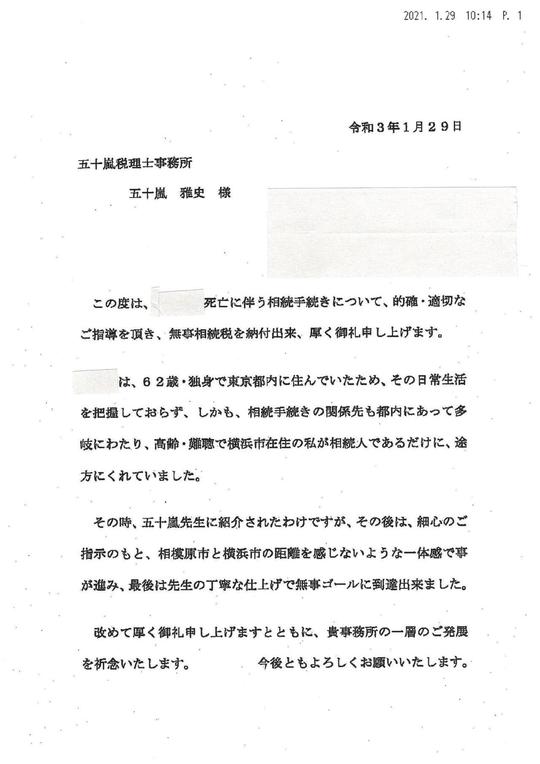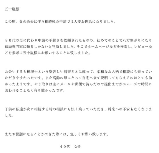 相続税申告が完了した後にこのようなメッセージをいただき、お役に立ててよかったと心から思いましたし、私の方こそ多大なご協力をいただき感謝したい気持ちで一杯です。当事務所にご依頼くださいましてありがとうございました。