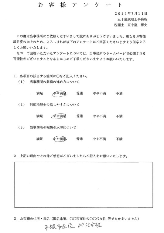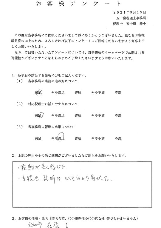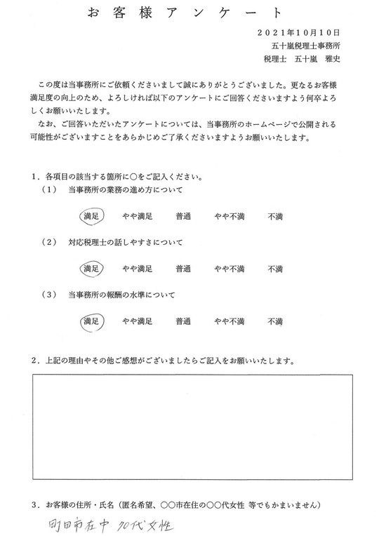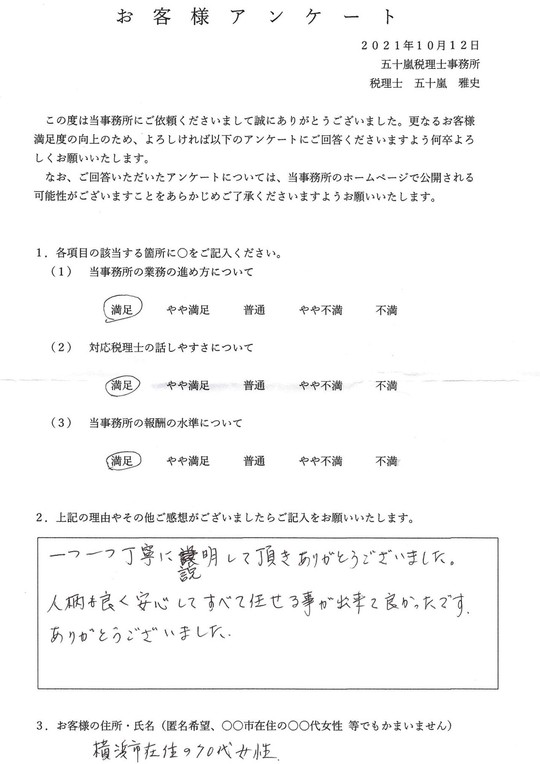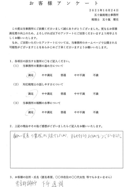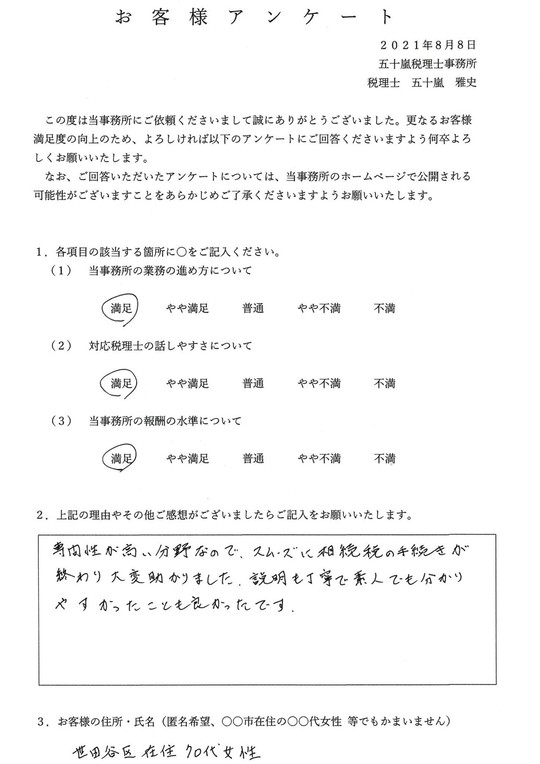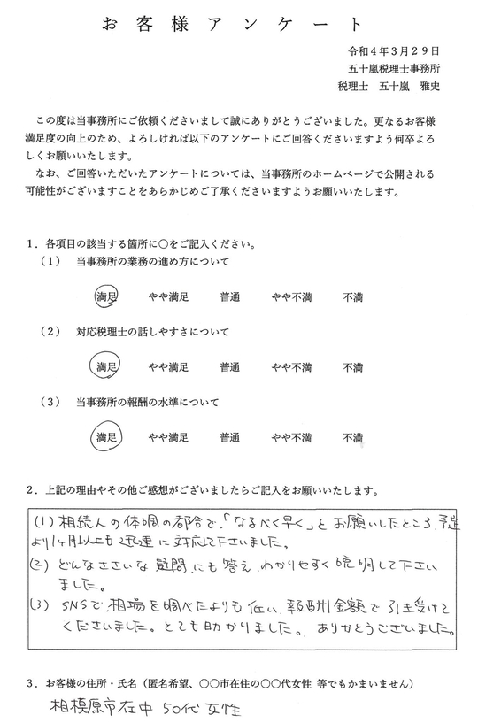 相続税申告を当事務所にご依頼くださいまして誠にありがとうございました。次回、もし何かでご依頼いただける場合は、より満足度が高いサービスをご提供できるよう研鑽してまいります。