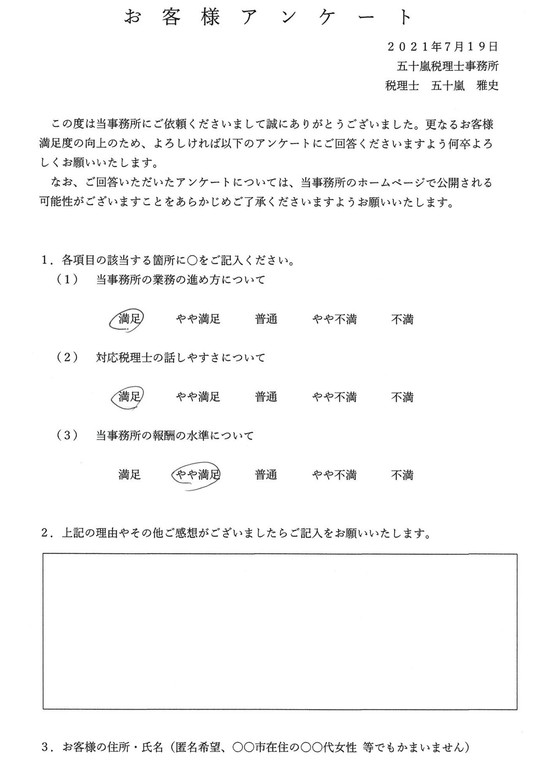 本件申告を当事務所にご依頼くださいまして誠にありがとうございました。今後ともどうぞよろしくお願いいたします。