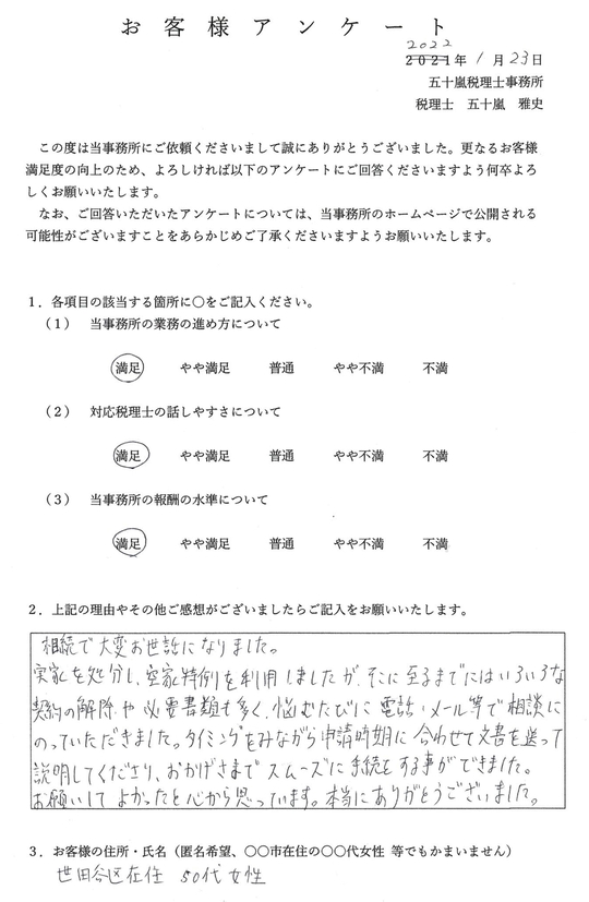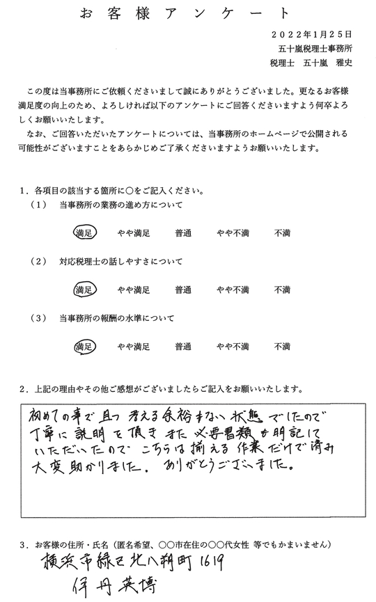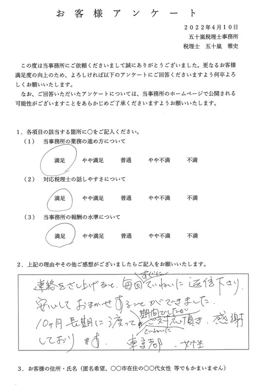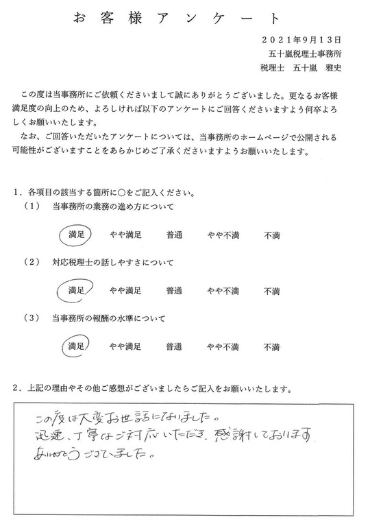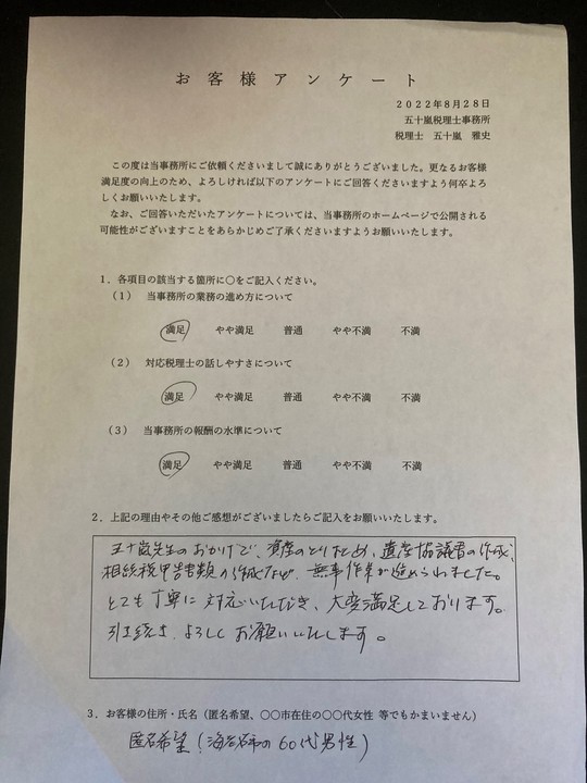 お客様には書類の収集等、迅速にご対応いただき本当に感謝しております。当事務所にご依頼くださいましてありがとうございました。